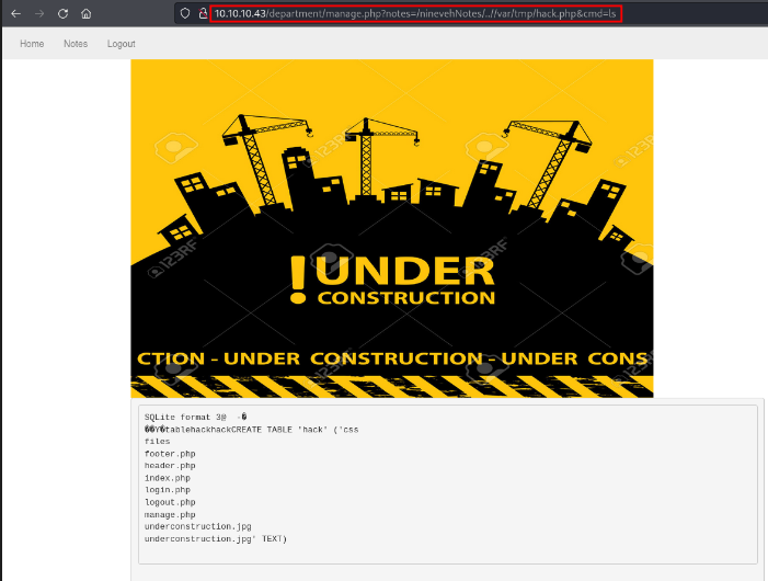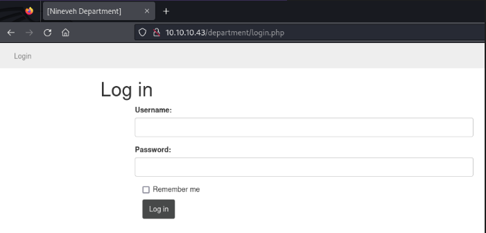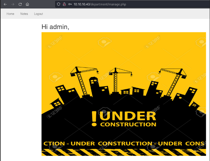 Descubrimos dos carpetas importantes: /db y /secure_notes. El directorio /db contiene una copia de phpLiteAdmin v1.9 y /secure_notes solo incluye una única imagen. Al ejecutar Dirsearch en el puerto 80, se revela otro directorio, /department, que contiene una página de inicio de sesión.