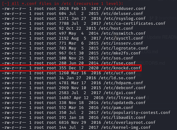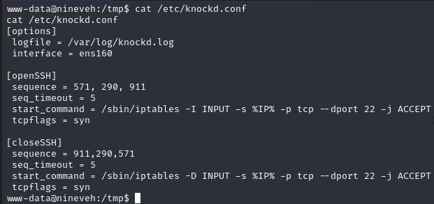 Encontramos el siguiente archivo de configuración que puede ser interesante, knockd.conf. Veamos su contenido.