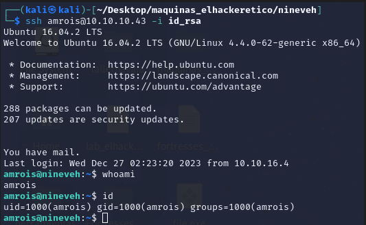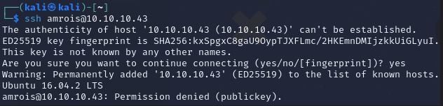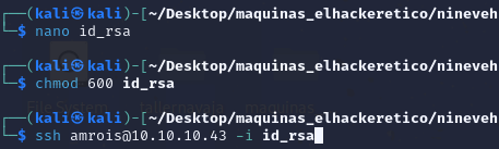 Vemos que ahora el puerto 22 está disponible, sin embargo, en la enumeración de puertos iniciar solo aparecían abiertos los puertos 80 y 443. Vamos a tratar de conectarnos a la máquina objetivo a través de SSH con el usuario que encontrábamos anteriormente «amrois».