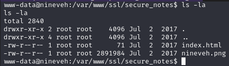 Después de enumerar múltiples directorios, recordamos la imagen que encontramos en el directorio /secure_notes del sitio Web ejecutado en el puerto 443. Si buscamos esa imagen en el servidor, podemos ver el gran peso lógico de la imagen.