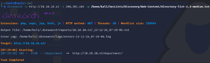 dirsearch -u http://10.10.10.43 -i 200,301,401 -w /home/kali/SecLists/Discovery/Web-Content/directory-list-2.3-medium.txt