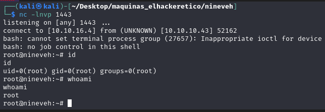 Y, ya recibiremos comunicación en nuestra máquina de ataque desde el objetivo con privilegios root.