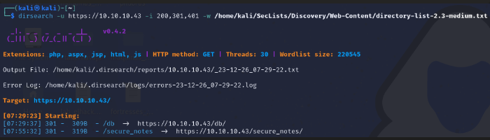 dirsearch -u https://10.10.10.43 -i 200,301,401 -w /home/kali/SecLists/Discovery/Web-Content/directory-list-2.3-medium.txt