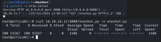 Llegado a este punto, vamos a tratar de obtener credenciales para este punto de aceso WIFI. Para esto, vamos a utilizar la herramienta OneShot. Transferimos esta herramienta a la máquina objetivo utilizando un servidor Python y curl.
