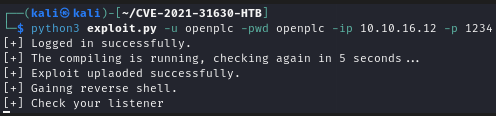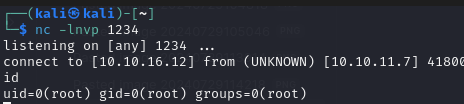 Vamos a ejecutar este exploit. Por otro lado, en nuestra máquina de ataque configuramos un oyente nc en el puerto 1234.