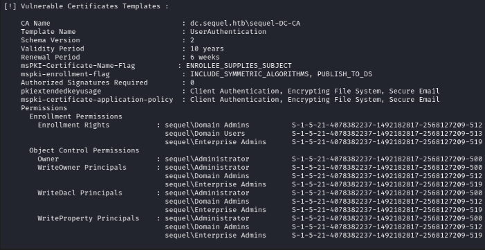 Una vez dentro, se pueden revisar los logs de MSSQL, donde se encuentran credenciales de otro usuario con mayores privilegios. Con estas nuevas credenciales, la enumeración revela una plantilla de certificado vulnerable (ESC1) en Active Directory Certificate Services (ADCS). Esta vulnerabilidad permite solicitar un certificado en nombre del usuario Administrador, obteniendo así su hash y accediendo completamente al sistema con privilegios máximos.