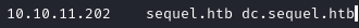 La enumeración de puertos de NMAP mostró del nombre de dominio sequel.htb y un certificado TLS para dc.sequel.htb. Vamos a este dominio al archivo /etc/hosts.