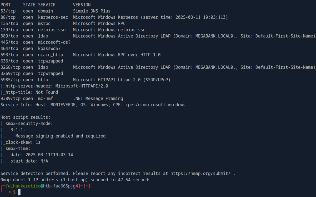 Comenzamos la resolución de la máquina Monteverde realizando el escaneo de puertos inicial.