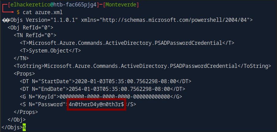 Enumeramos el contenido del archivo azure.xml que hemos descargado en nuestro equipo.
