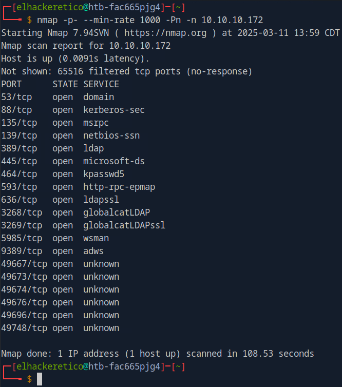 nmap -p53,88,135,139,389,445,464,593,636,3268,3269,5985,9389 -sVC -Pn -n 10.10.10.172