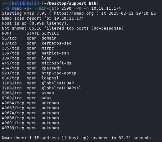 Comenzamos la resolución de la máquina «Support», realizando un escaneo de puertos masivo sobre el objetivo.