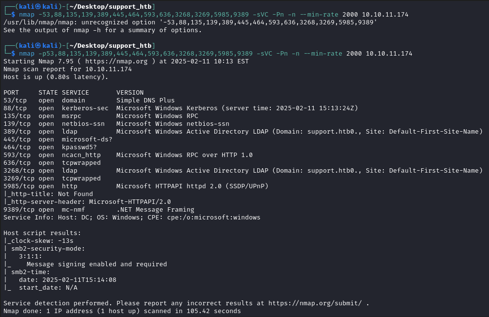 nmap -p53,88,135,139,389,445,464,593,636,3268,3269,5985,9389 -sVC -Pn -n --min-rate 2000 10.10.11.174