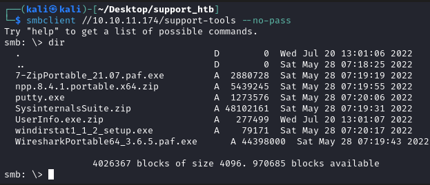 smbclient //10.10.11.174/support-tools --no-pass