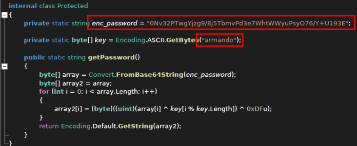Si seguimos investigando, encontramos una contraseña cifrada con la key «armando». Vamos a trabajar sobre la password cifrada localizada. Para ello, utilizamos el siguiente script: