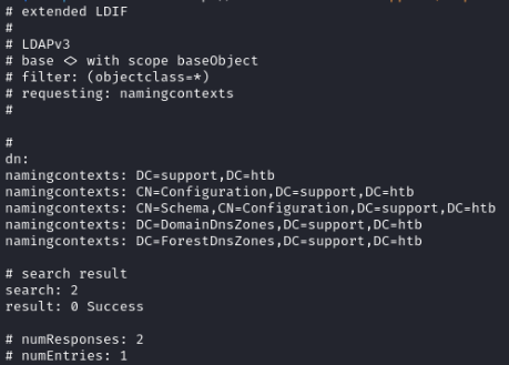ldapsearch -x -H ldap://10.10.11.174 -D 'support\ldap' -w '' -s base -b '' namingcontexts
