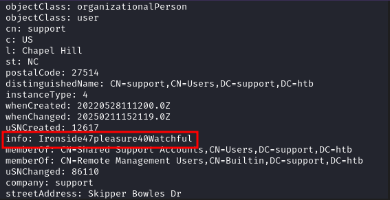 ldapsearch -x -H ldap://10.10.11.174 -D 'support\ldap' -w 'nvEfEK16^1aM4$e7AclUf8x$tRWxPWO1%lmz' -b 'CN=Users,DC=support,DC=htb'