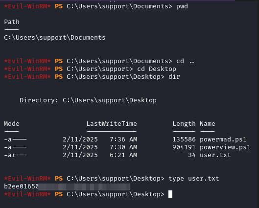 Durante la enumeración, se identifica un usuario llamado support, cuyo campo de información (info) contiene su contraseña. Con estas credenciales, se establece una conexión WinRM a la máquina. Una vez dentro, se recopila información del dominio utilizando BloudHound-Python, y con BloodHound se descubre que el grupo Shared Support Accounts, al cual pertenece el usuario support, posee privilegios GenericAll sobre el objeto de la máquina del controlador de dominio. Esto permite ejecutar un ataque de Resource-Based Constrained Delegation (RBCD) para obtener una shell con privilegios de NT Authority\System.