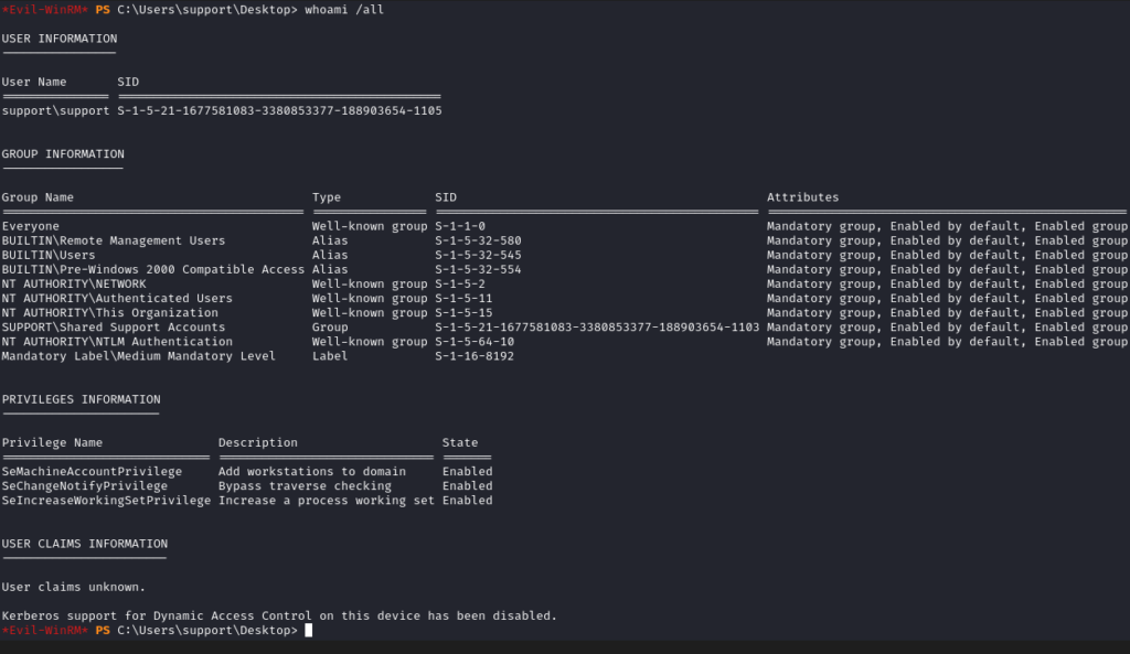 Vemos un nombre de grupo llamativo: SUPPORT\Shared Support Accounts. Este es un grupo creado y puede tener relación con la carpeta compartida que analizamos al inicio de este CTF.