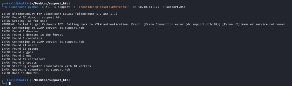 bloodhound-python -c All -u support -p 'Ironside47pleasure40Watchful' -ns 10.10.11.174 -d support.htb