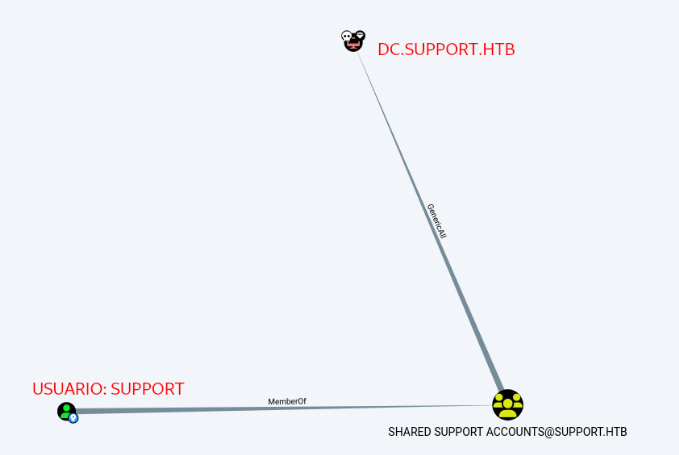 Recordamos que el usuario «support» es miembro del grupo «SHARED SUPPORT ACCOUNTS» que tiene privilegios ‘Generic All’ sobre el controlador de dominio. Vamos a comprobar como explotar esto.