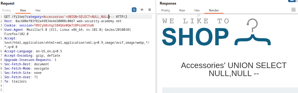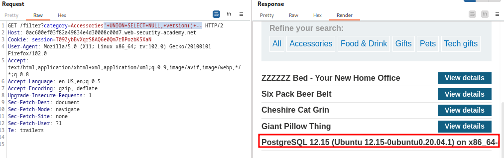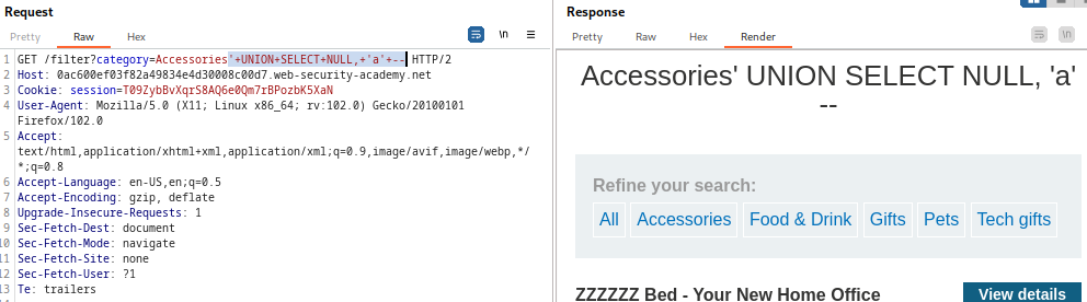 Este laboratorio contiene una vulnerabilidad de inyección SQL en el filtro de categoría de producto. Los resultados de la consulta se devuelven en la respuesta de la aplicación para que pueda usar un ataque UNION para recuperar datos de otras tablas.