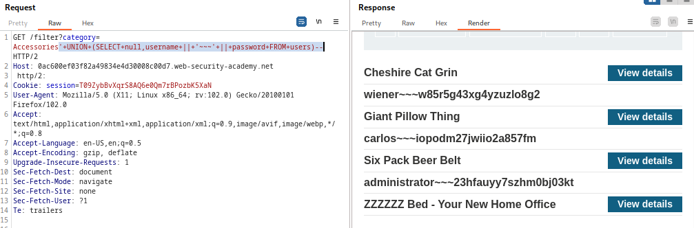Para resolver el laboratorio, realice un ataque UNION de inyección SQL que recupere todos los nombres de usuario y contraseñas, y use la información para iniciar sesión como usuario administrator.