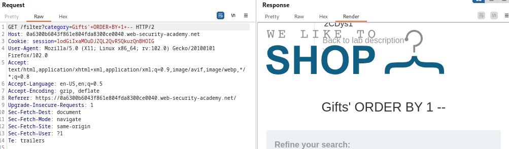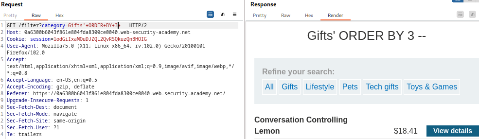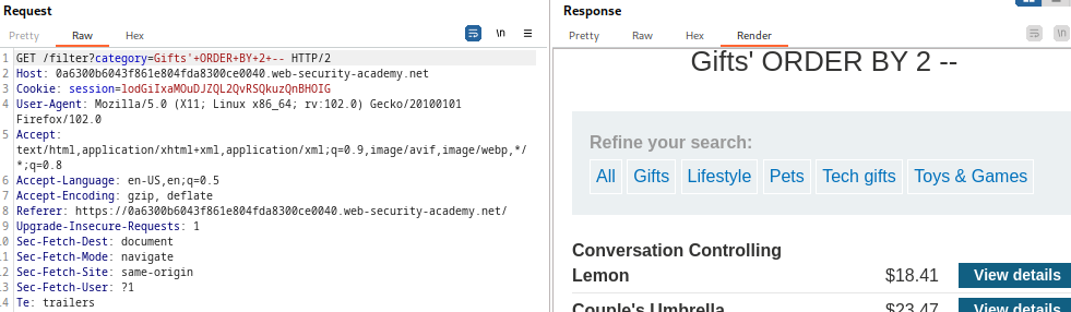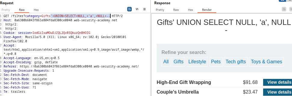Este laboratorio contiene una vulnerabilidad de inyección SQL en el filtro de categoría de producto. Los resultados de la consulta se devuelven en la respuesta de la aplicación, por lo que puede usar un ataque UNION para recuperar datos de otras tablas. Para construir un ataque de este tipo, primero debe determinar el número de columnas devueltas por la consulta.  El siguiente paso es identificar una columna que sea compatible con los datos de cadena.