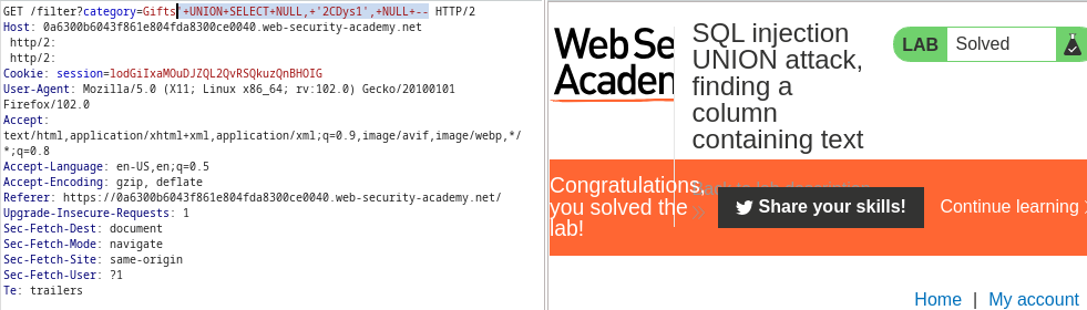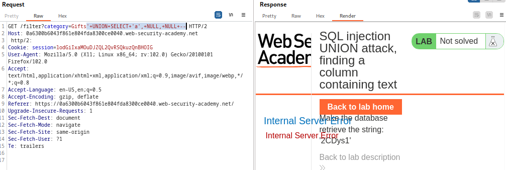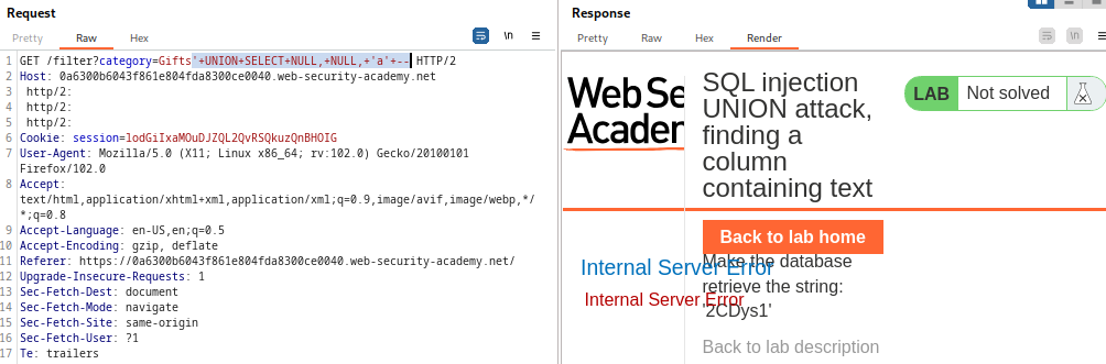 El laboratorio proporcionará un valor aleatorio que debe hacer que aparezca en los resultados de la consulta. Para resolver el laboratorio, realice un ataque UNION de inyección SQL que devuelva una fila adicional que contenga el valor proporcionado. Esta técnica lo ayuda a determinar qué columnas son compatibles con los datos de cadena.