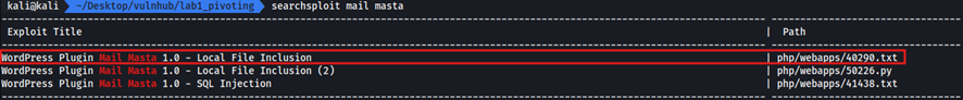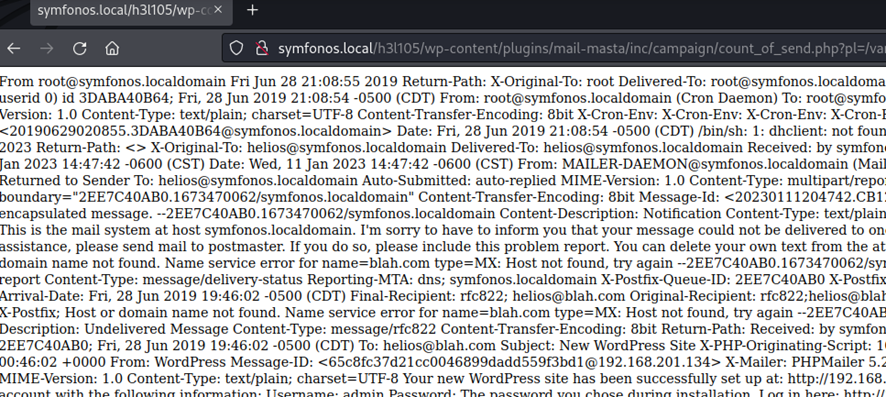 Si recordamos el resultado del escaneo, había un servidor de correo ejecutándose en el puerto 25. Al mismo tiempo, recordamos que el WordPress está ejecutando el plugin mail-masta, ¿Interesante? Vamos a comprobarlo.