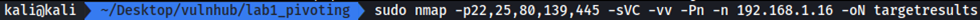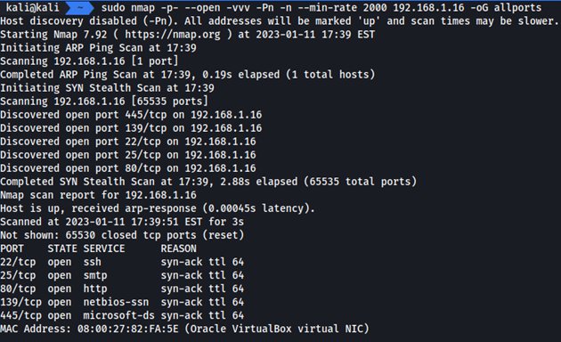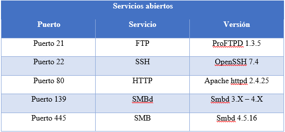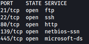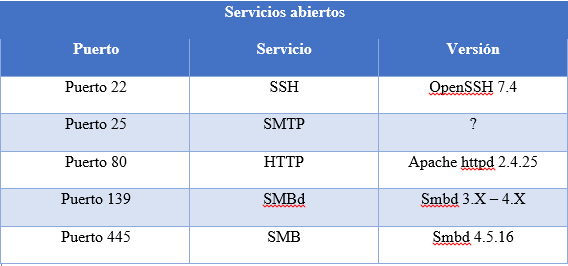 Están los puertos 22, 25, 80, 139 y 445 abiertos. El siguiente paso será realizar un escaneo más profundo de los servicios abiertos.