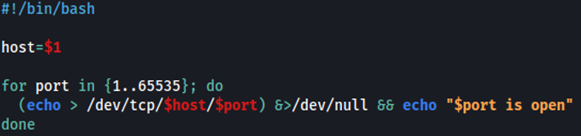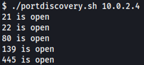 Tenemos dos IP en la red 10.0.2.0/24. La IP 10.0.2.5 es la que corresponde a la máquina Symfonos 1 mientras que la IP 10.0.2.4 corresponde a la máquina Symfonos 2. También podemos enumerar los servicios que tiene disponible esta IP. Para ello creamos otro pequeño script en bash que sirve para detectar servicios abiertos. El código de este script es el siguiente:
