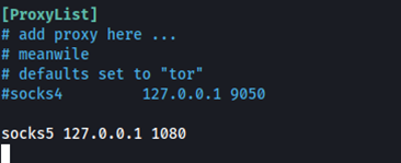 Vemos que se ha creado una conexión de tipo socks a la escucha en el puerto 1080. Para que esto funcione deberemos crear una conexión socks para ese puerto en el archivo /etc/proxychains.conf. Añadimos la siguiente línea en el archivo.