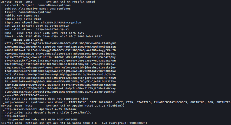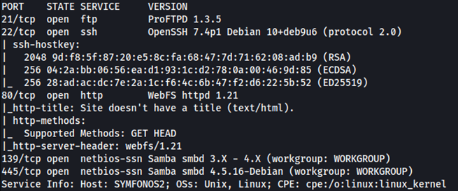 Como siempre, comenzamos escaneando los servicios que tiene abiertos la máquina Symfonos 2.