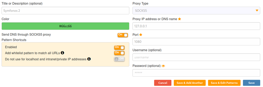 Si intentamos acceder a la dirección IP 10.0.2.4 desde el navegador, este no va a poder acceder puesto que no tiene conexión con la máquina Symfonos 2. Para arreglar esto, vamos a utilizar Foxy Proxy para poder establecer el túnel al sitio Web de Symfonos 2. Foxy Proxy lo configuramos de la siguiente manera: