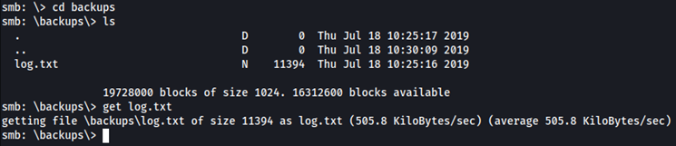 Existe una cuenta anónima disponible que contiene una carpeta backups que contiene un archivo log.txt. Lo descargamos en nuestra máquina atacante para ver su contenido.